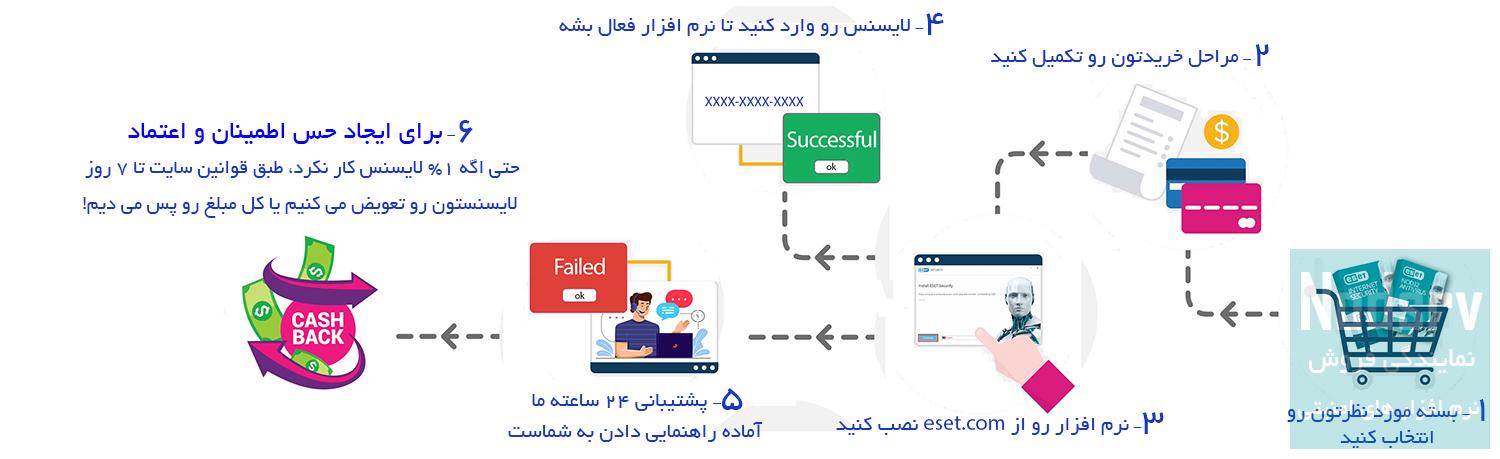 همانطور که در سوال اول گفته شد کد لایسنس ارجینال باید در نرم افزاری که از سایت رسمی eset دانلود و نصب میکنید فعال شود و نباید نسخه های کرک شده یا دستکاری شده ایرانی که در پک یا CD ارائه می شود را نصب کرد. لایسنس ارجینال همواره باید قابلیت فعال سازی در نسخه رسمی آنتی ویروس را داشته باشد. لایسنس ارجینال یک کد 20 حرفی است و نباید حتی یک حرف کمتر و بیشتر باشد . بعد از نصب انتی ویروس از سایت رسمی آنتی ویروس به نشانی eset.com فقط لایسنس را از ما تهیه کنید و در برنامه وارد کنید تا تمامی امکانات برنامه فعال شود.