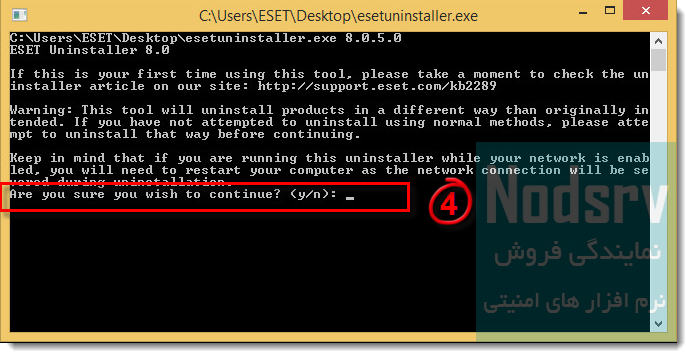 4- در این قسمت از شما سوال می شود که آیا برای حذف آنتی ویروس از کامپیوتر خود مطمئن هستید ؟ برای ادامه حذف کلید y کیبورد را وارد کنید و و کلید Enter کیبورد را بزنید.