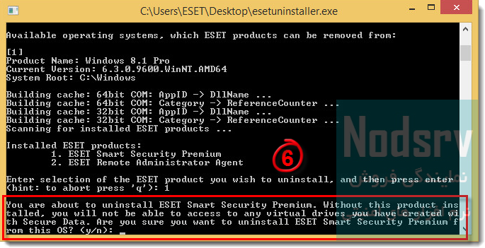 6- در این بخش مجدد در مورد اطمینان از حذف آنتی ویروس از شما سوال می شود که برای ادامه حذف کلید y کیبورد را وارد کنید و و کلید Enter کیبورد را بزنید.